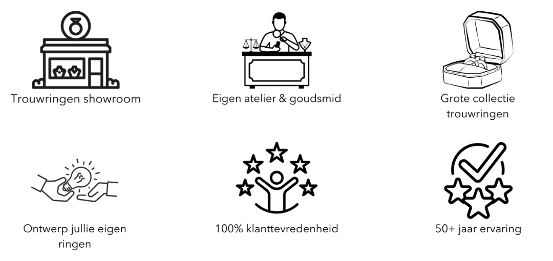 Door een persoonlijke benadering, heldere keuzes en eerlijke begeleiding wordt het uitzoeken van trouwringen iets om samen écht van te genieten.